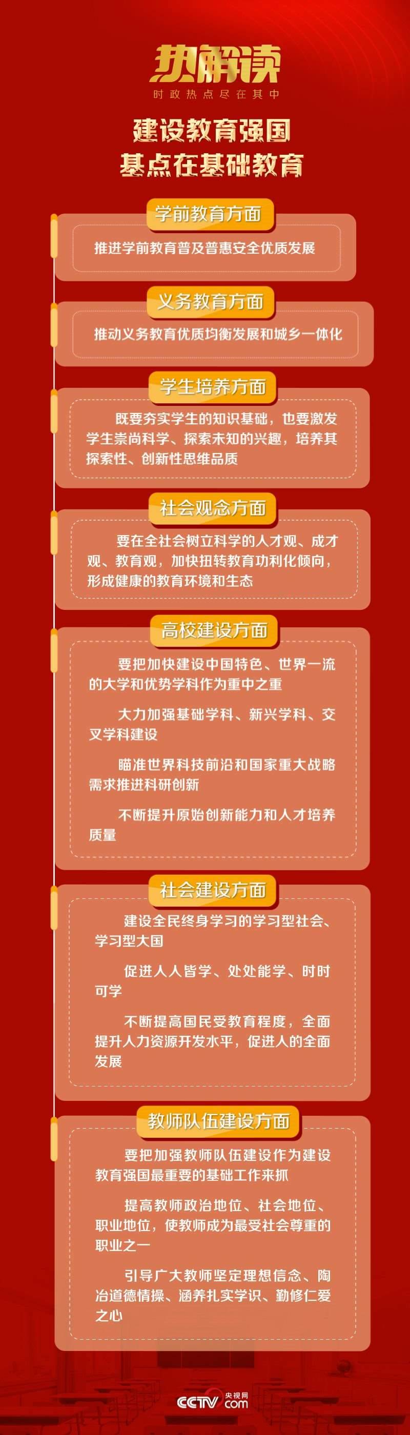 學(xué)前教育普及普惠安全優(yōu)質(zhì)發(fā)展;義務(wù)教育優(yōu)質(zhì)均衡發(fā)展和城鄉(xiāng)一體化;在全社會(huì)樹立科學(xué)的人才觀、成才觀、教育觀……這些始終是總書記關(guān)心的重點(diǎn)。做什么、怎么做,總書記明確給出了推動(dòng)基礎(chǔ)教育、加快建設(shè)高質(zhì)量教育體系的方法路徑。