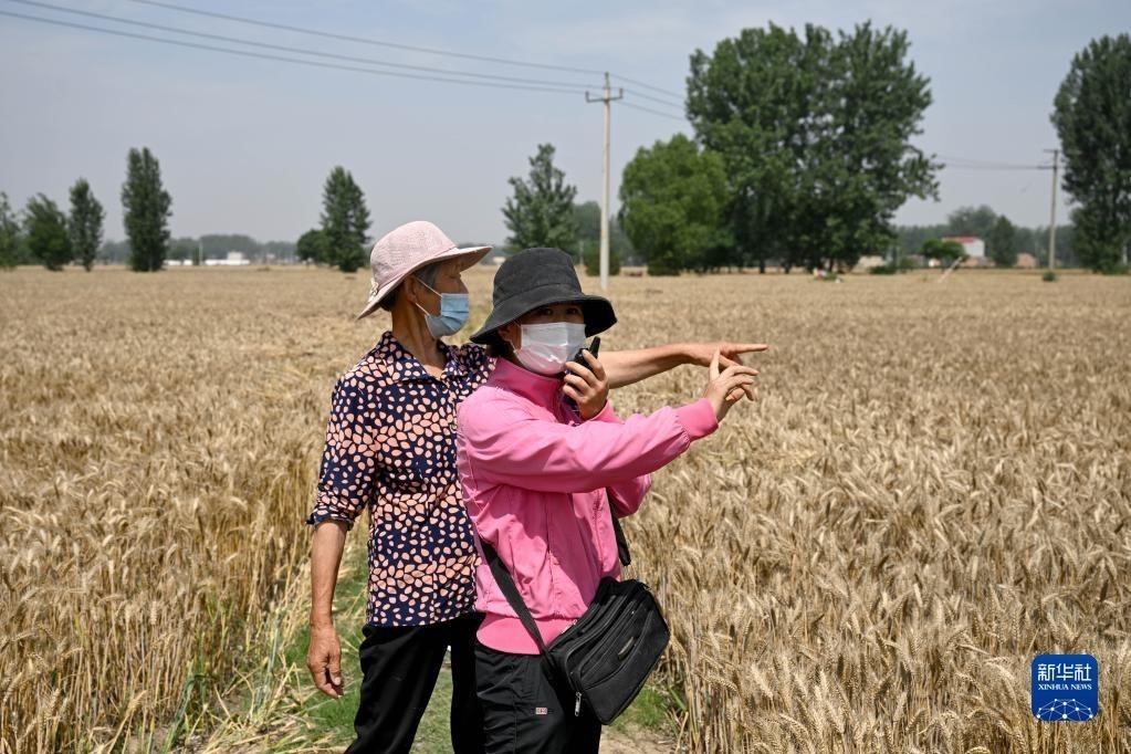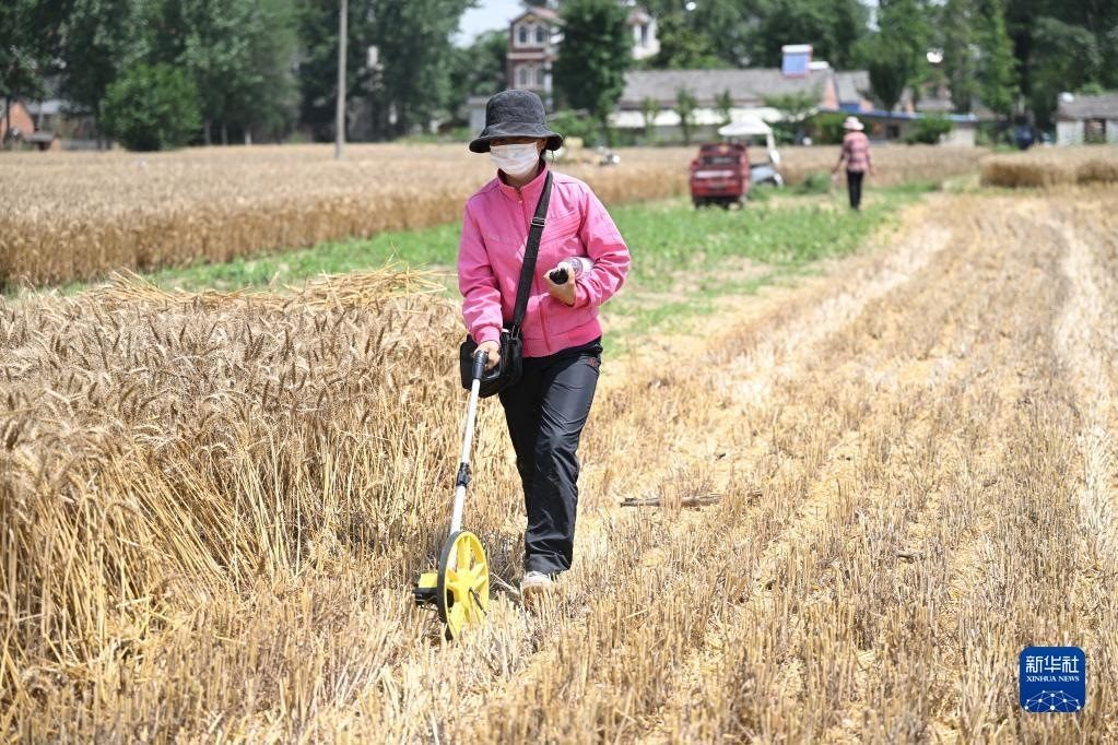 6月2日,在安徽省阜陽市阜南縣許堂鄉(xiāng)劉崗村,陳麗娟使用農(nóng)田測畝儀測量麥田的面積。