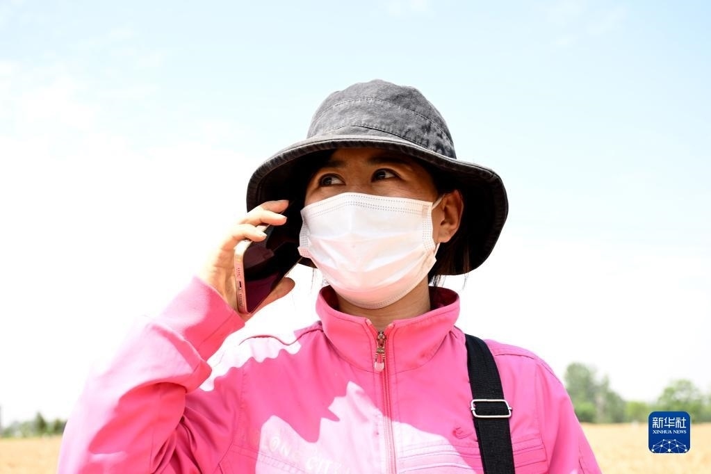 6月2日,在安徽省阜陽市阜南縣許堂鄉(xiāng)劉崗村,陳麗娟和朋友電話聯(lián)系下一站的收割業(yè)務(wù)。