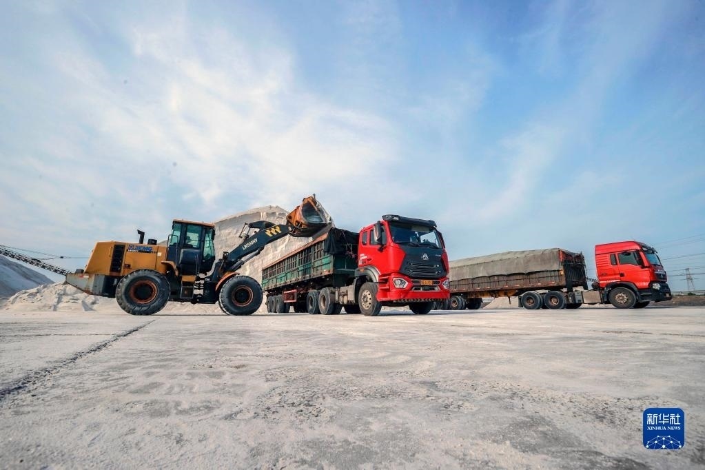 6月4日,工人操作設(shè)備在唐山海港經(jīng)濟(jì)開(kāi)發(fā)區(qū)長(zhǎng)蘆大清河鹽場(chǎng)將海鹽裝車,準(zhǔn)備外運(yùn)。