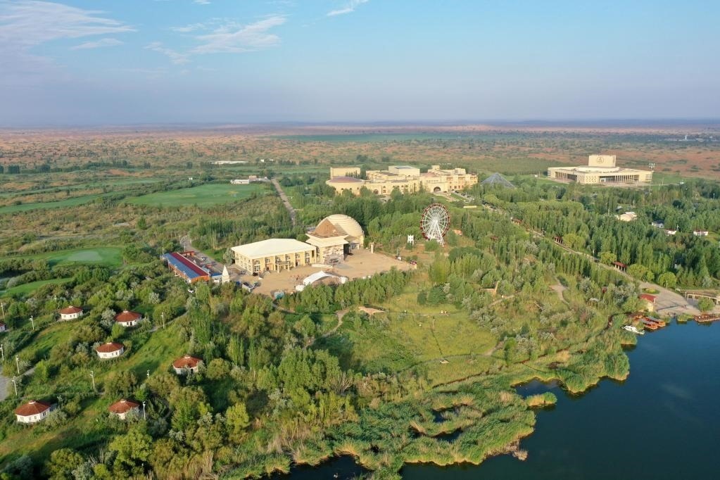 這是內(nèi)蒙古鄂爾多斯市庫布其沙漠腹地的七星湖景區(qū)(2021年7月17日攝,無人機(jī)照片)。新華社記者 金良快 攝