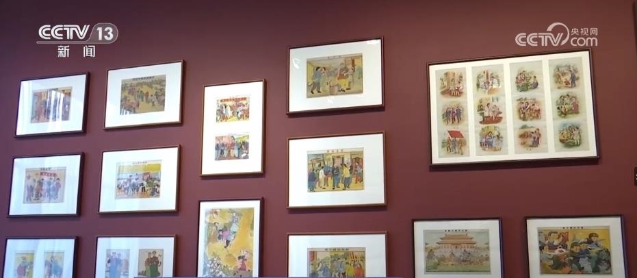 跟隨著講解員,再往前走,國家版本館的特色館藏——年畫、連環(huán)畫和宣傳畫出現(xiàn)在眼前。這面墻上和展柜集中展出了47幅新中國成立初期的新年畫。畫家李可染在1950年創(chuàng)作的《新得的黃?!返茸髌?,展現(xiàn)出老百姓感受到新中國新生活的幸福和美好。