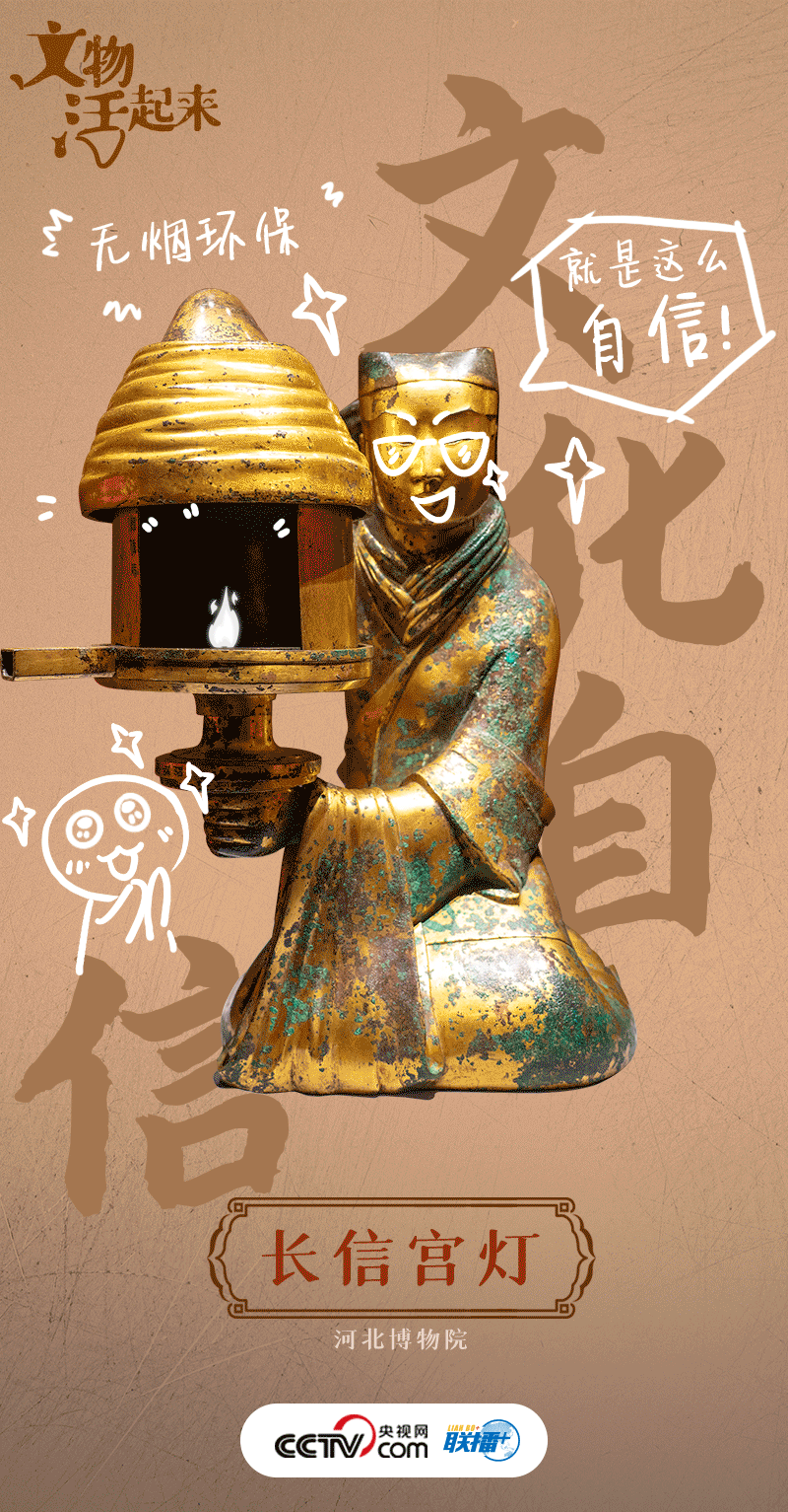這盞燈來(lái)自西漢(公元前202年-公元8年),因燈身刻有“長(zhǎng)信尚浴”的銘文而得名長(zhǎng)信宮燈。長(zhǎng)信宮燈設(shè)計(jì)巧妙,是目前所見(jiàn)唯一一件漢代人形銅燈,整件燈分為六個(gè)部分,每部分都可以簡(jiǎn)單地拆卸重裝,宮女的袖管與身體連接形成排煙通道,環(huán)保設(shè)計(jì)理念獨(dú)特、超前,被譽(yù)為“中華第一燈”。