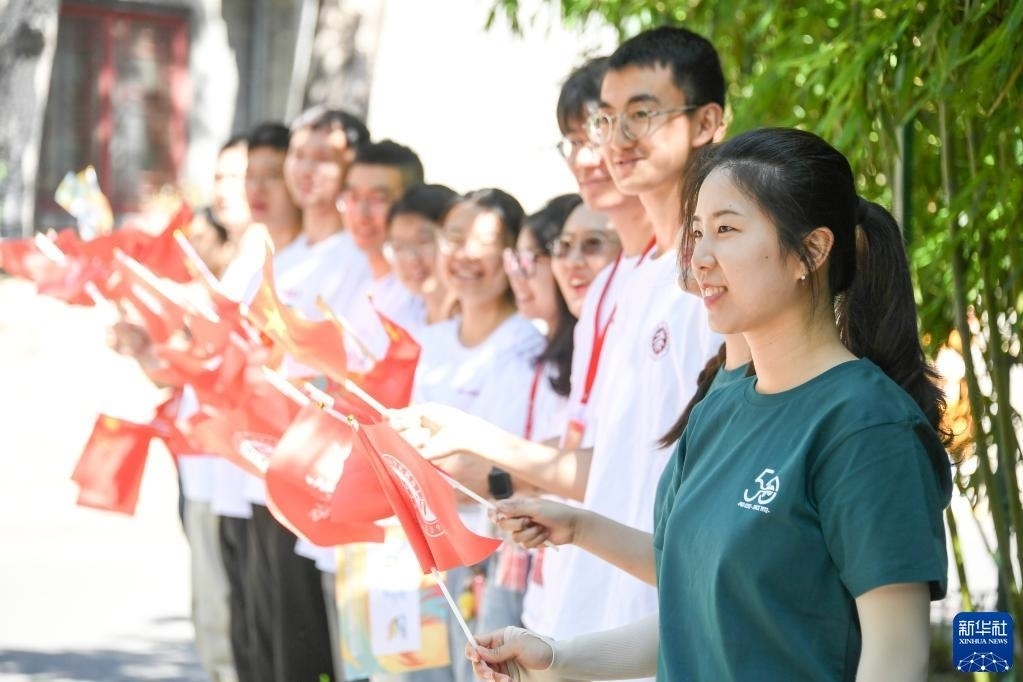 6月10日,大學(xué)生為火炬手加油。
