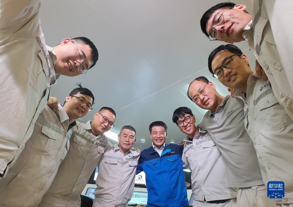 6月11日,在深中通道海底隧道管節(jié)最終接頭合龍后,中交一航局深中項(xiàng)目測(cè)管中心負(fù)責(zé)人鎖旭宏(中)和團(tuán)隊(duì)成員一起慶賀。