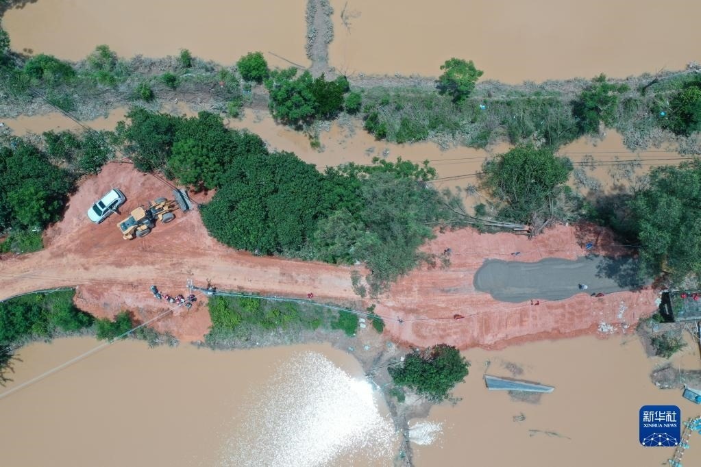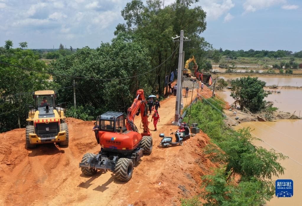 6月11日,在廣西合浦縣白沙鎮(zhèn),工人在施工修復遭洪水損毀的堤壩(無人機照片)。   新華社記者 陸波岸 攝