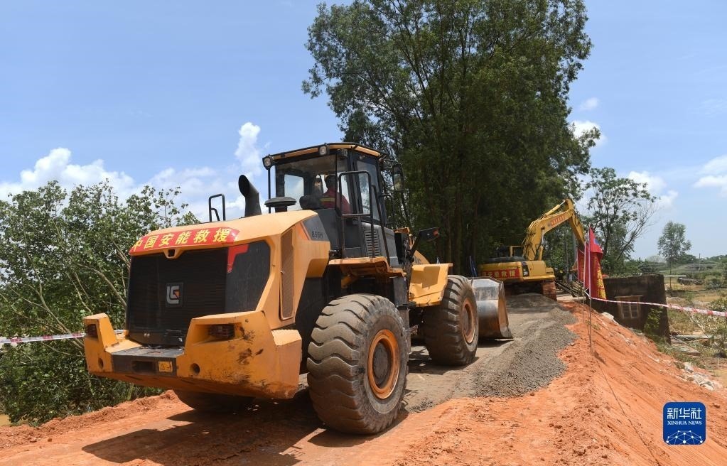 6月11日,在廣西合浦縣白沙鎮(zhèn),工人在施工修復遭洪水損毀的堤壩。   新華社記者 陸波岸 攝