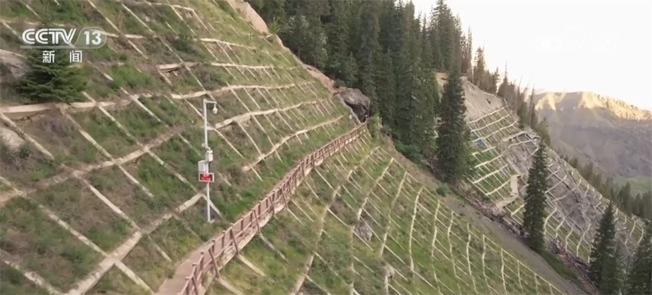 天池的水來自于天山深處的冰川融水,由南向北形成多條瀑布、河流,一路向山下奔流,成為當(dāng)?shù)刂匾霓r(nóng)業(yè)灌溉水源,滋養(yǎng)著下游80多萬畝土地。我們現(xiàn)在看到這些鋪在山野中的網(wǎng)格,就是當(dāng)?shù)卣谶M(jìn)行的生態(tài)修復(fù)與地質(zhì)災(zāi)害防治工程,人們在這些網(wǎng)格間播撒草籽,來穩(wěn)定區(qū)域生態(tài)環(huán)境,有效防范地質(zhì)災(zāi)害的發(fā)生。