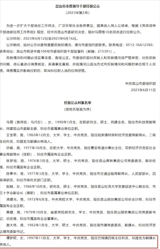 ·中共昆山市委組織部干部監(jiān)督科回應(yīng)97年出生女子擬提名副鎮(zhèn)長(zhǎng):是按正常流程進(jìn)行,有問題可以監(jiān)督舉報(bào)。