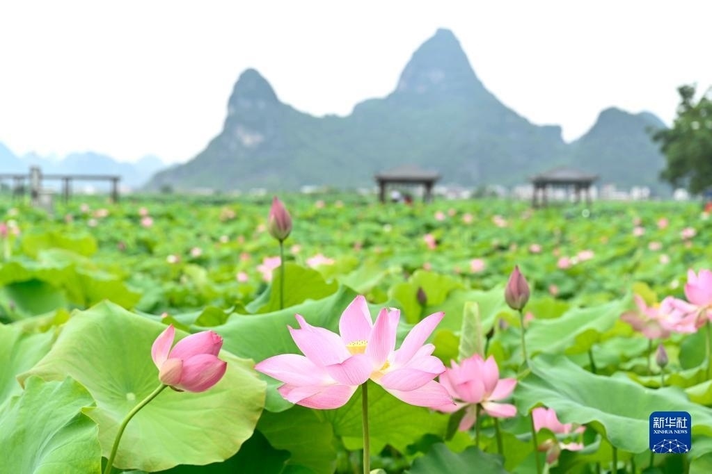 時(shí)下,廣西柳州市柳江區(qū)百朋鎮(zhèn)萬畝荷塘里的各色荷花競相綻放,吸引游客前來賞花游玩。新華社發(fā)(黎寒池 攝)