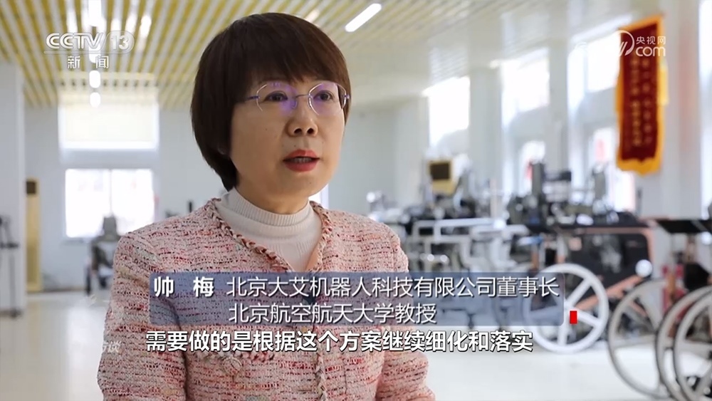 北京大艾機器人科技有限公司董事長、北京航空航天大學(xué)教授帥梅:“就是通過外骨骼機器人訓(xùn)練,來給他建立正確的行走模式,以及正確的本體感覺,讓他能重新行走?!?/p>