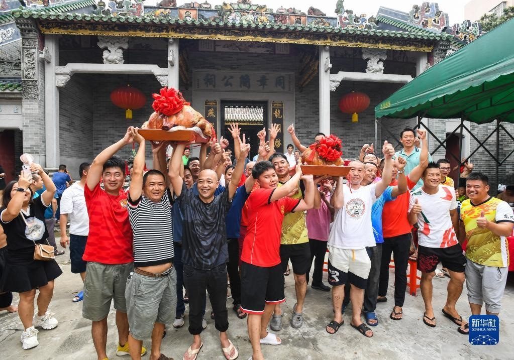 6月15日,2023年車陂龍舟競(jìng)渡第一名“范陽(yáng)簡(jiǎn)”龍船會(huì)的成員們?cè)诩异羟疤е?jiǎng)品燒豬慶祝。