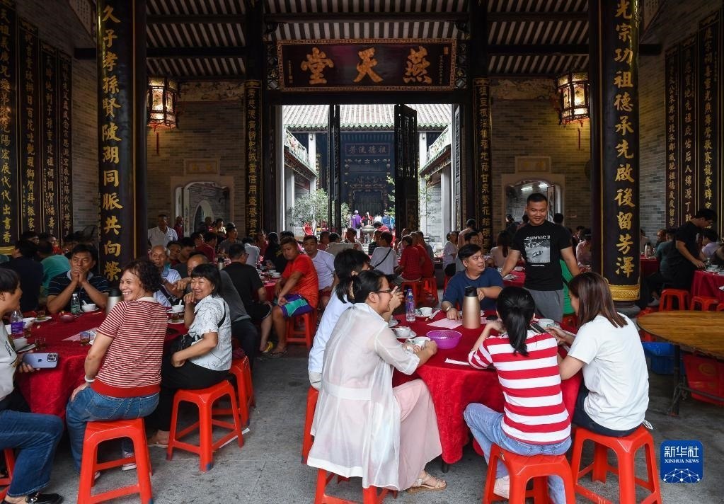 6月15日,2023年車陂龍舟競(jìng)渡第一名“范陽(yáng)簡(jiǎn)”龍船會(huì)在簡(jiǎn)氏家祠里擺下幾十桌龍船飯慶祝。