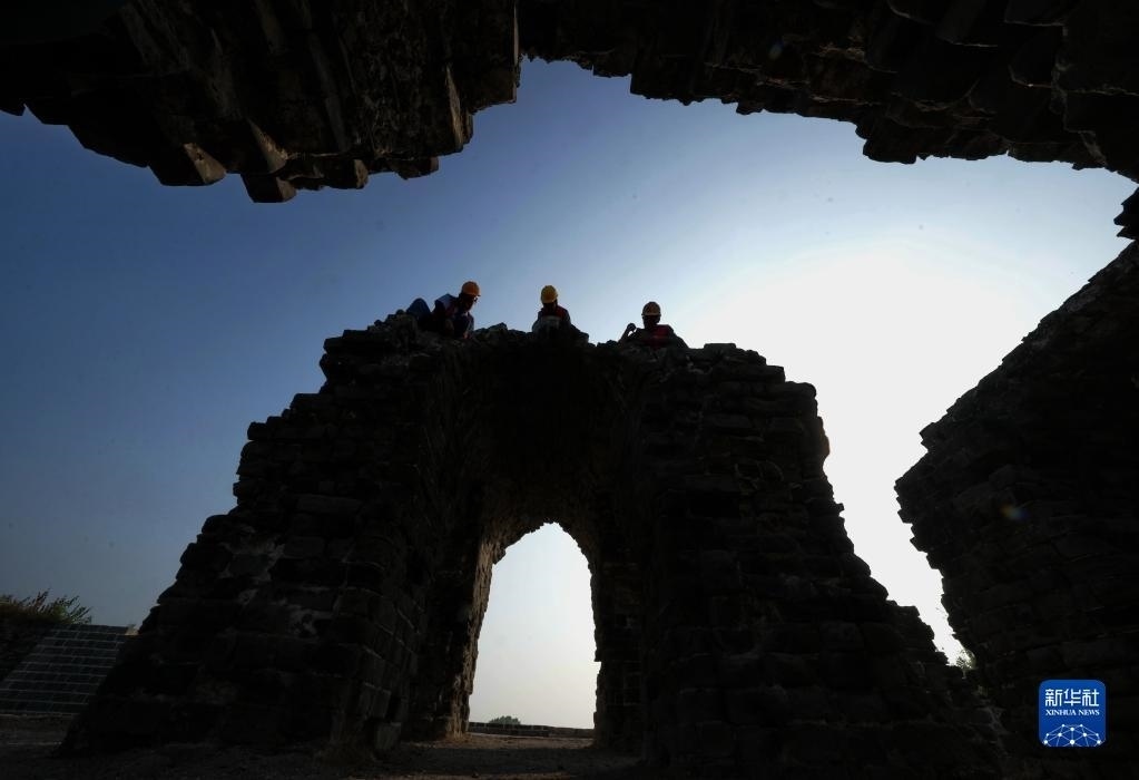 6月15日,工人在山海關(guān)長城腰鋪9號(hào)敵臺(tái)修繕工地施工。