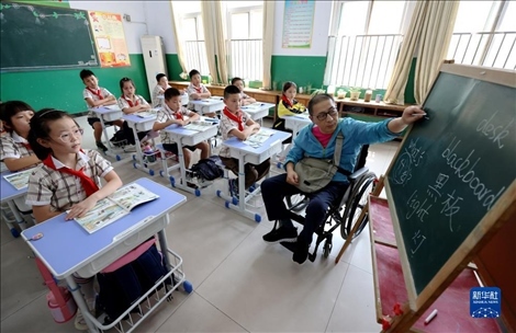 今年48歲的楊季剛是山東省棗莊市永安鎮(zhèn)遺棠小學(xué)一名鄉(xiāng)村教師,從教已28年。2017年初,楊季剛因意外摔成重傷,終生將與輪椅為伴??恐B強的毅力,歷經(jīng)康復(fù)訓(xùn)練的艱辛,2018年秋季楊季剛?cè)缙诨氐搅诵@,在特制1米高的小黑板上頑強地續(xù)寫他的教師生涯。