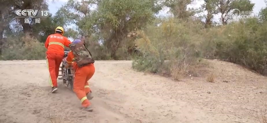 因?yàn)楣茏o(hù)面積大,中午護(hù)林員只能用攜帶的干糧充饑。為了近距離查看胡楊樹(shù)的情況,他們大多數(shù)時(shí)候要在林中小路里穿梭。有的地方路況不好,就需要推著摩托車(chē)行走,難免遇到連人帶車(chē)陷進(jìn)沙地里的情況,要格外小心。