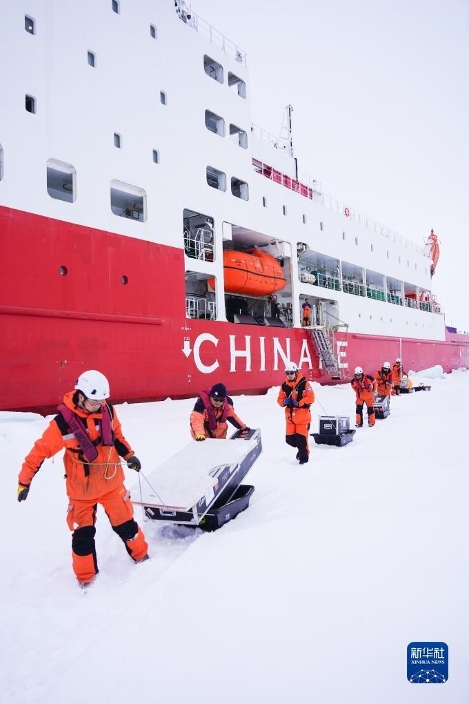 北京時間5日上午10時,作業(yè)結(jié)束。上船稍事休整,考察隊(duì)全體成員下到冰面拍攝大合影。合影間隙,科考隊(duì)員三五成群,舉著臨時制作的標(biāo)語橫幅,在“雪龍2”號前拍照留念。