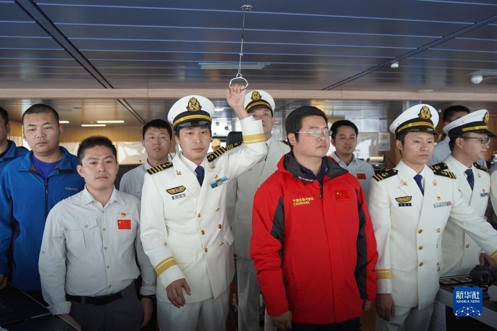 報(bào)告聲響徹駕駛臺,“雪龍2”號船長肖志民旋即拉響汽笛。接著,“雪龍2”號停止前行,中國第13次北冰洋科學(xué)考察隊(duì)領(lǐng)隊(duì)王金輝走向廣播臺,通過全船廣播宣告——