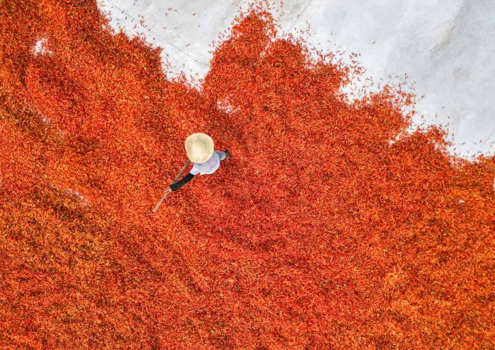 ↑2023年8月24日,安徽省亳州市譙城區(qū)古城鎮(zhèn)油河村,農(nóng)民在晾曬辣椒。CICPHOTO/楊中勤 攝