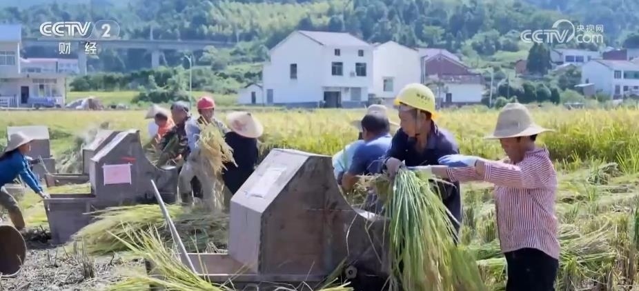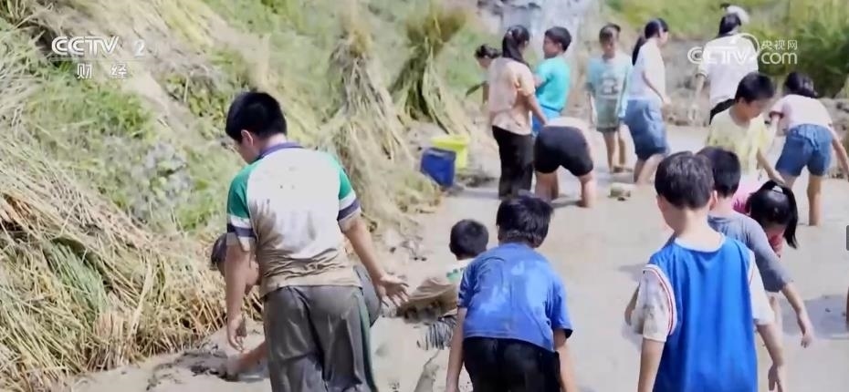 為慶祝“巨型稻”試種成功,當(dāng)?shù)剡€舉行了一場(chǎng)“扮禾抓魚”比賽,村民們分成幾組,進(jìn)行人工收割、踩禾桶脫粒、扎稻草。孩子們則跳進(jìn)水溝抓魚,感受田園樂趣。