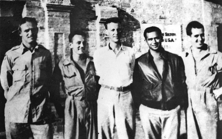 二戰(zhàn)期間,被新四軍營救的5名美國飛虎隊(duì)飛行員在新四軍駐地合影(1944年8月攝)。新華社發(fā)