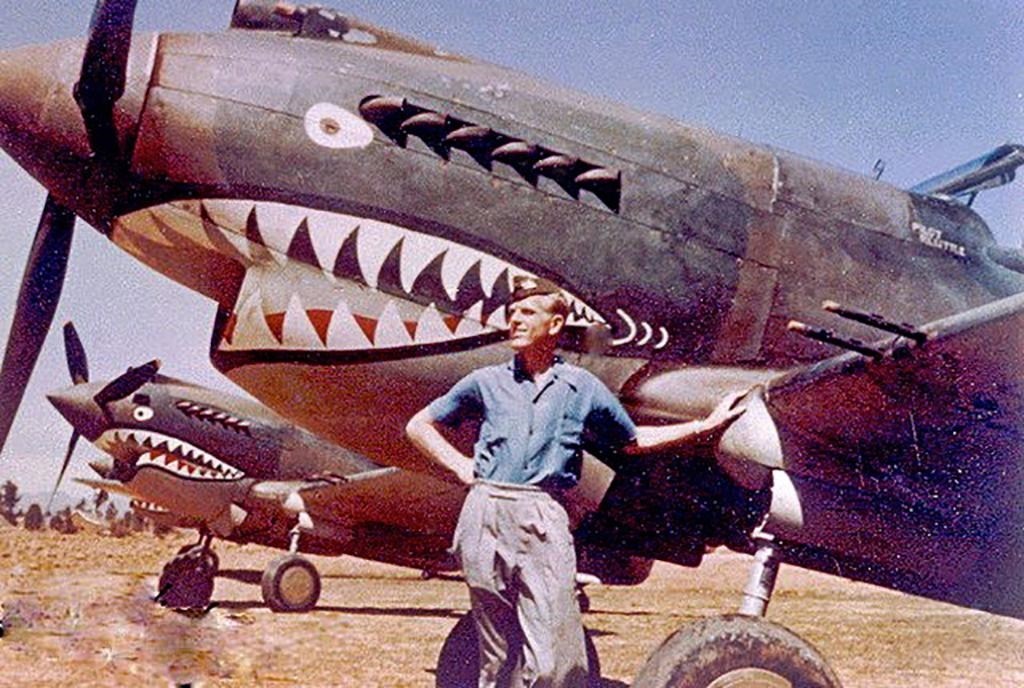 這是在二戰(zhàn)時期的昆明巫家壩機(jī)場,一名飛虎隊(duì)隊(duì)員在涂裝有“鯊魚嘴”標(biāo)志的戰(zhàn)斗機(jī)前留影的資料照片。新華社發(fā)