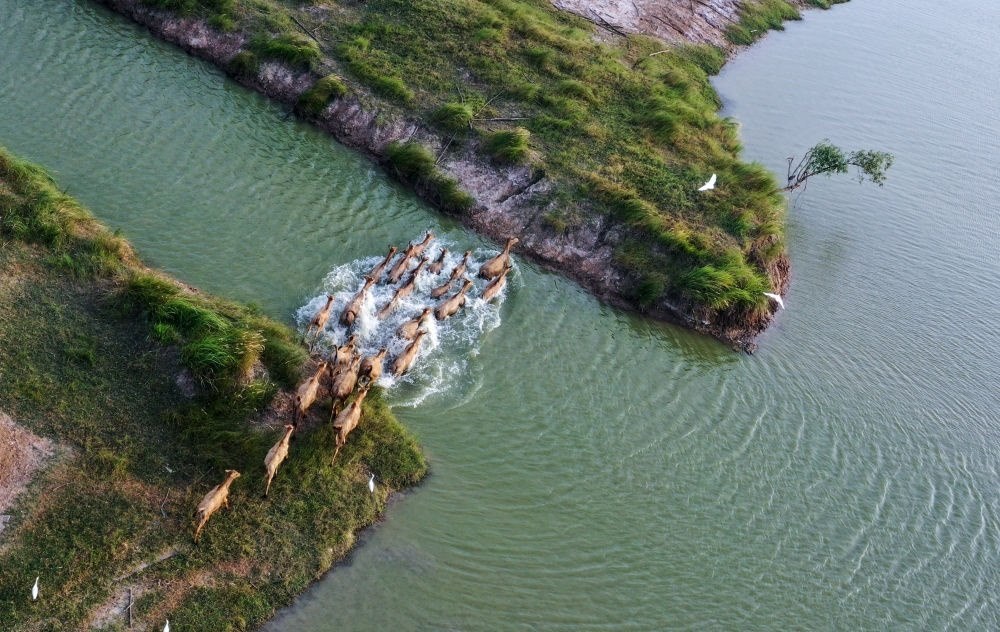 一群麋鹿在江蘇大豐麋鹿國家級(jí)自然保護(hù)區(qū)野鹿蕩渡河(無人機(jī)照片,8月20日攝)。
