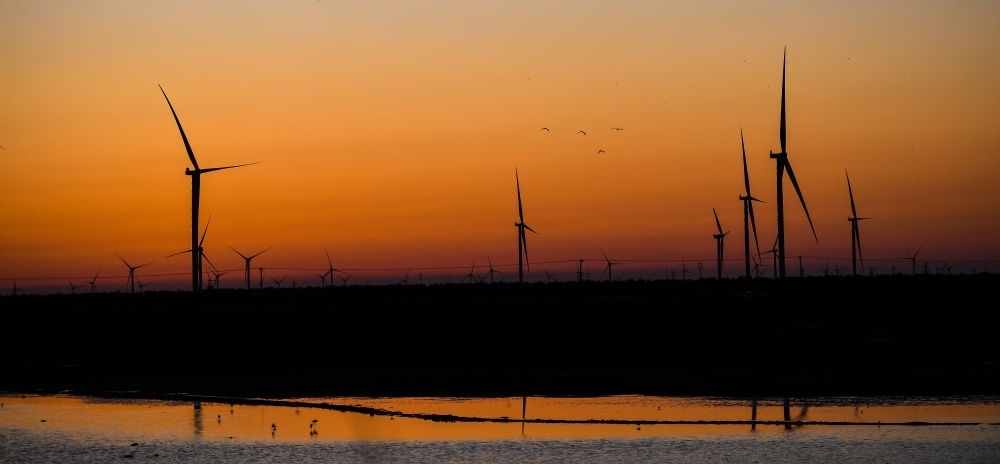落日時(shí)分拍攝的東臺(tái)沿海經(jīng)濟(jì)區(qū)風(fēng)力發(fā)電機(jī)組(無人機(jī)照片,8月31日攝)。