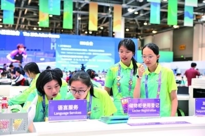 9月22日,亞運會主新聞中心的志愿者們在工作。本報記者 楊震攝/光明圖片