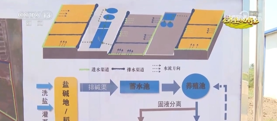 王永利說,通過淡水灌溉會將鹽堿田里的鹽和堿排出地塊,排出的鹽堿水通過一道道排水溝循環(huán)到蓄水池,最后被輸送到養(yǎng)殖池里養(yǎng)魚,養(yǎng)魚產(chǎn)生的排泄物經(jīng)過過濾后回輸?shù)剿咎?,這樣的漁農(nóng)綜合利用模式讓鹽堿地不斷變好。
