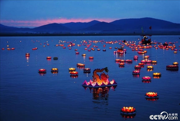9月24日,吉林,蛟河市漂河鎮(zhèn)富江村舉行豐收節(jié)放河燈活動,村民和游人把一盞盞河燈放入松花湖中,表達對美好生活的向往與期盼。