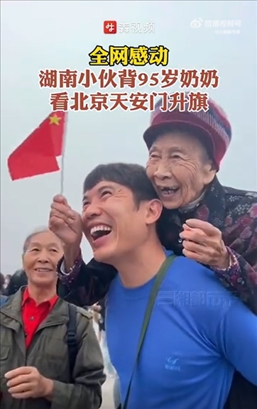 近日,湖南一名男子背著95歲的奶奶,從永州出發(fā)到北京天安門看升國旗??粗逍羌t旗冉冉升起,祖孫兩人露出了幸福的笑容。網友:這是“最美的風景”。