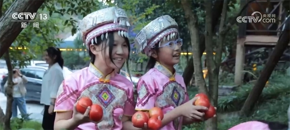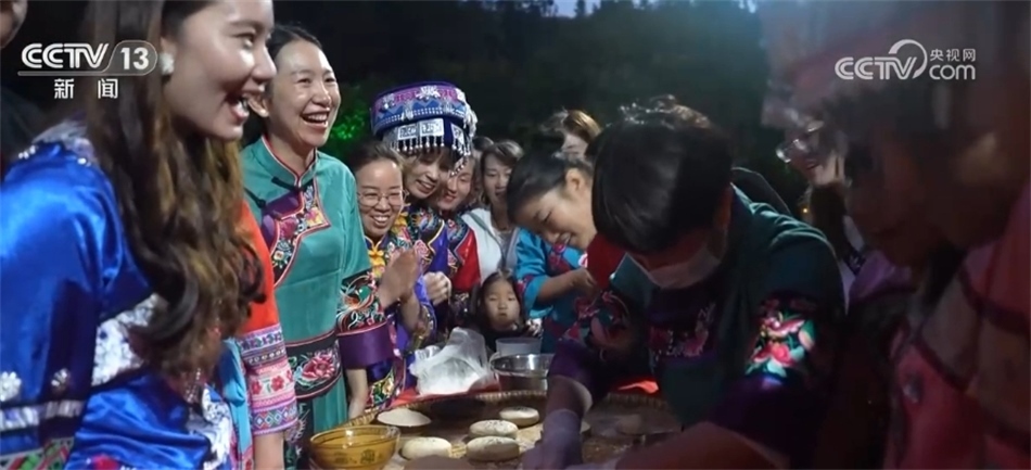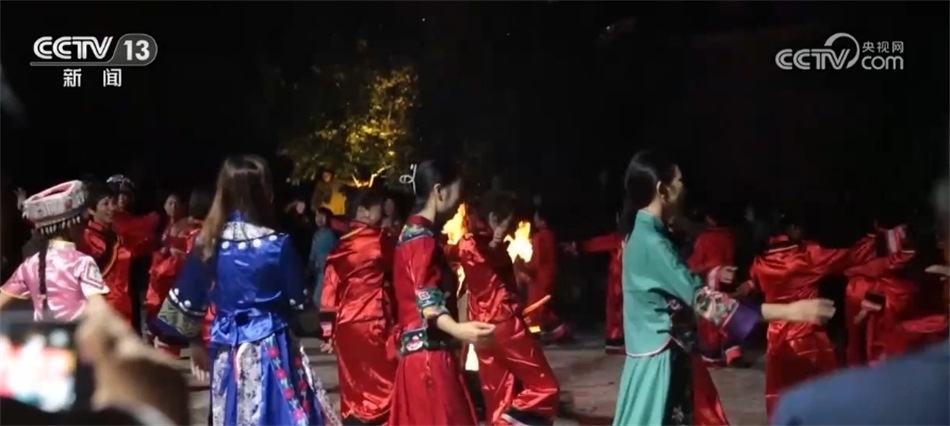 隨著歡快的音樂響起,當(dāng)?shù)卮迕翊┥仙术r艷的節(jié)日盛裝,踏著鼓點,圍著篝火跳起土家擺手舞,豐收的喜悅洋溢在村民們的臉上,游客們加入其中,大家手牽著手,共同舞出金秋和美鄉(xiāng)村新畫卷。