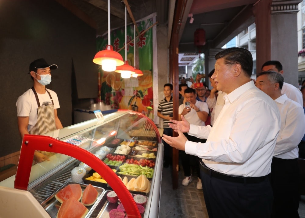 2020年10月13日,習(xí)近平在廣東省汕頭市步行察看小公園開埠區(qū)街區(qū)人文歷史風(fēng)貌時,同現(xiàn)場群眾親切交流。
