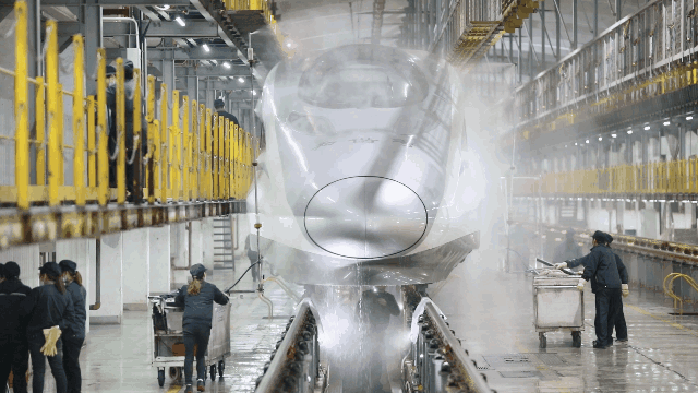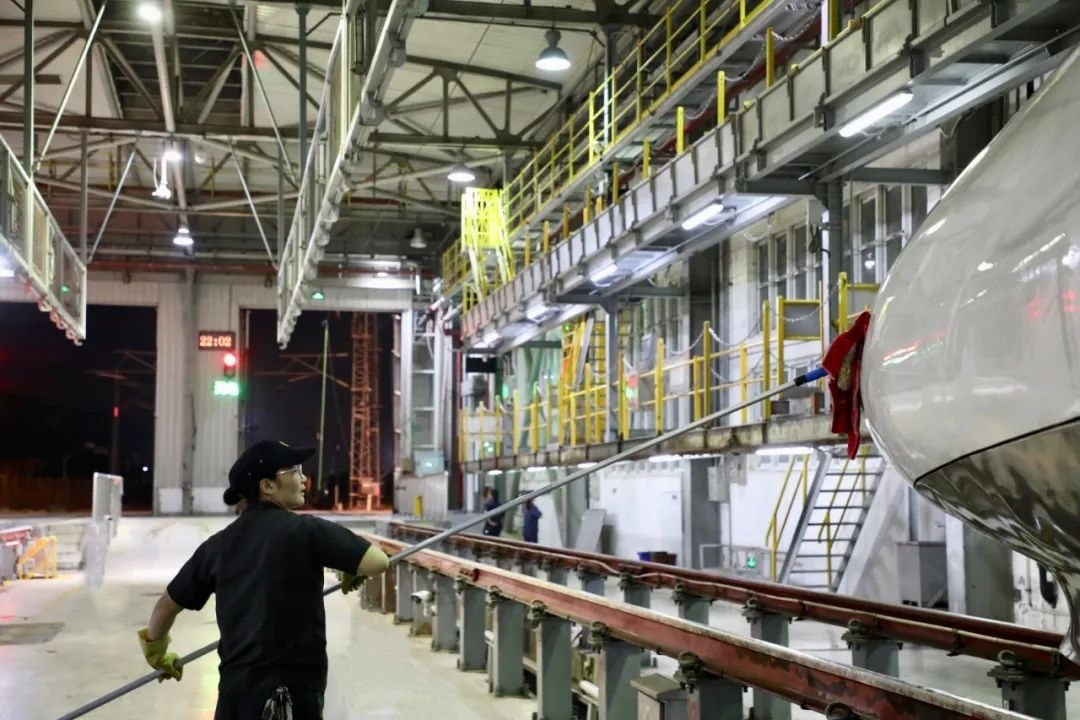 動(dòng)車組經(jīng)過洗車機(jī)時(shí),調(diào)度室內(nèi)調(diào)度員精準(zhǔn)聯(lián)控司機(jī),機(jī)房有專業(yè)的設(shè)備操作人員負(fù)責(zé)監(jiān)控,確保洗車機(jī)正常運(yùn)轉(zhuǎn),外皮清洗到位。在動(dòng)車檢修庫內(nèi),質(zhì)檢員全方位卡控人工清洗環(huán)節(jié),檢查清潔是否到位。