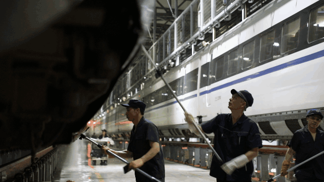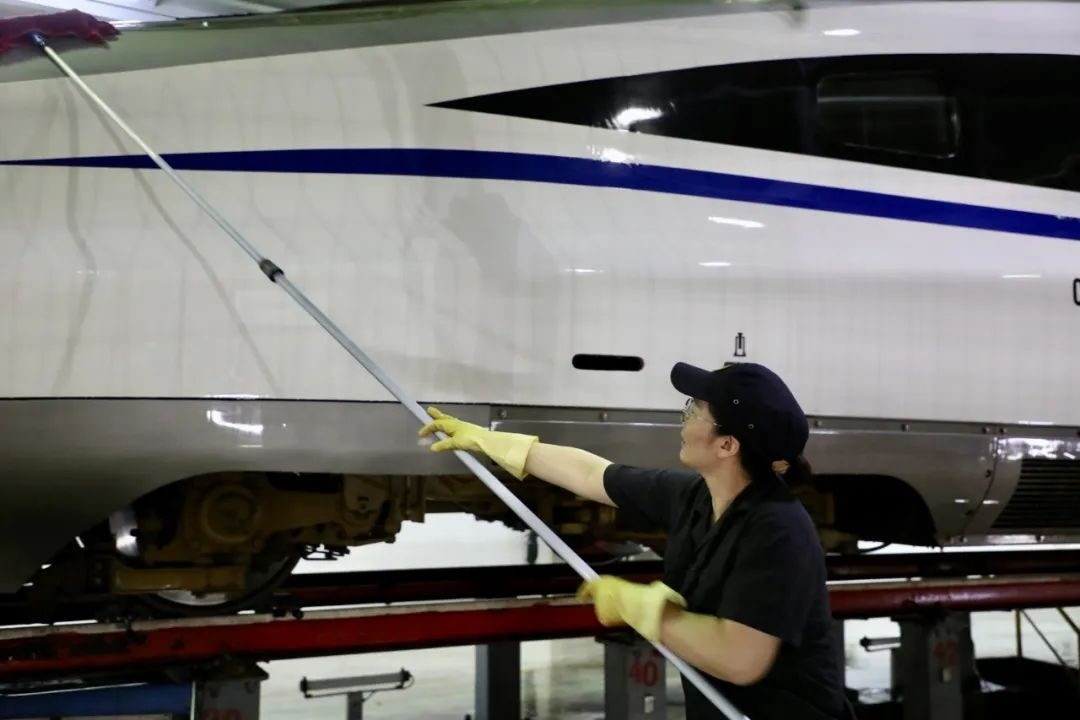 經(jīng)過自動(dòng)清洗的動(dòng)車組在開進(jìn)動(dòng)車所檢修庫后,將由洗車人員進(jìn)行深度清潔。20多名洗車人員分工協(xié)作對動(dòng)車組車頂、車身等各部位進(jìn)行清洗。