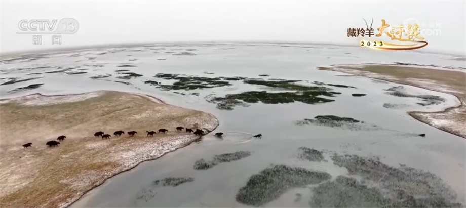 昆侖山下生態(tài)畫卷養(yǎng)眼 野牦牛成群游嬉過河愜意漫游