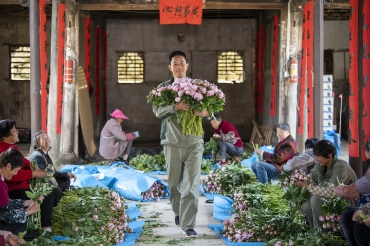 今年春天,浦江縣杭坪鎮(zhèn)烏漿村,薛勇帶著村民整理包裝采摘的芍藥花,“鮮花經(jīng)濟”帶動村民共同奔富。共享聯(lián)盟·金華中心 胡肖飛 攝