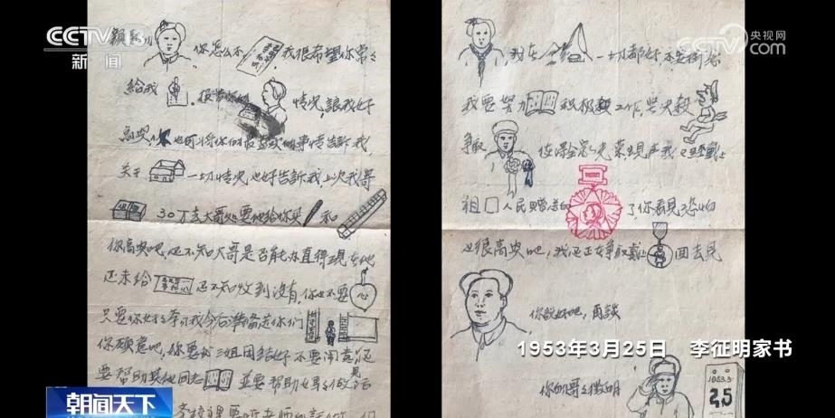 這是一封1953年3月25日從抗美援朝戰(zhàn)場發(fā)往江蘇宿遷的信。在這封戰(zhàn)地家書中,志愿軍戰(zhàn)士李征明為未來的奮斗目標(biāo)做出規(guī)劃。因?yàn)槊妹脗兊哪挲g還很小、識(shí)字不多,李征明擔(dān)心她們看不懂,就在信中畫上了許多圖文并茂的小畫。