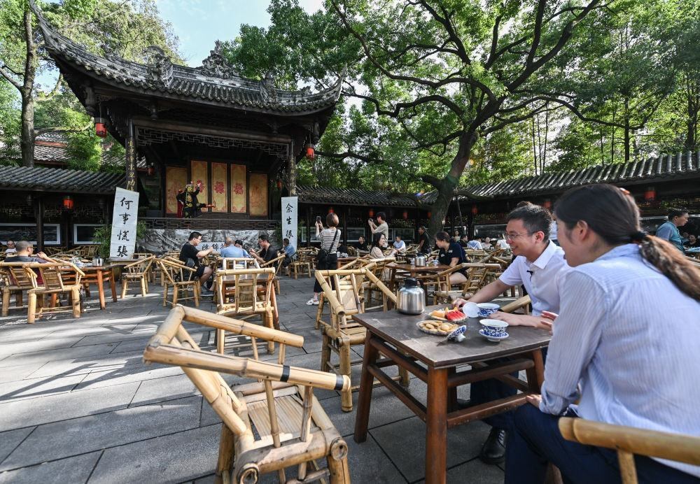 7月14日,在成都高新區(qū)鐵像寺水街,游客在茶鋪體驗(yàn)當(dāng)?shù)靥厣w碗茶。新華社記者 王曦 攝