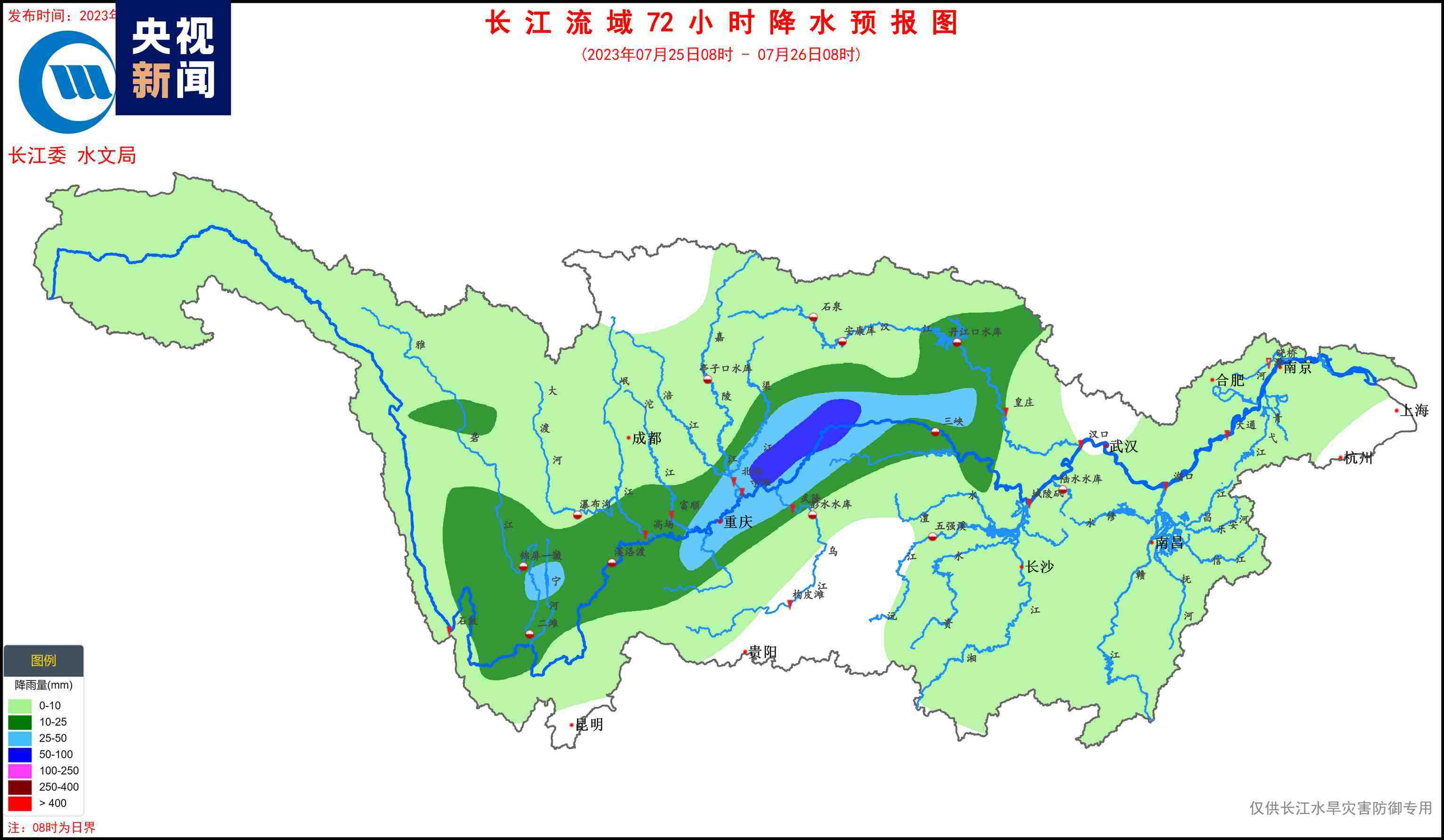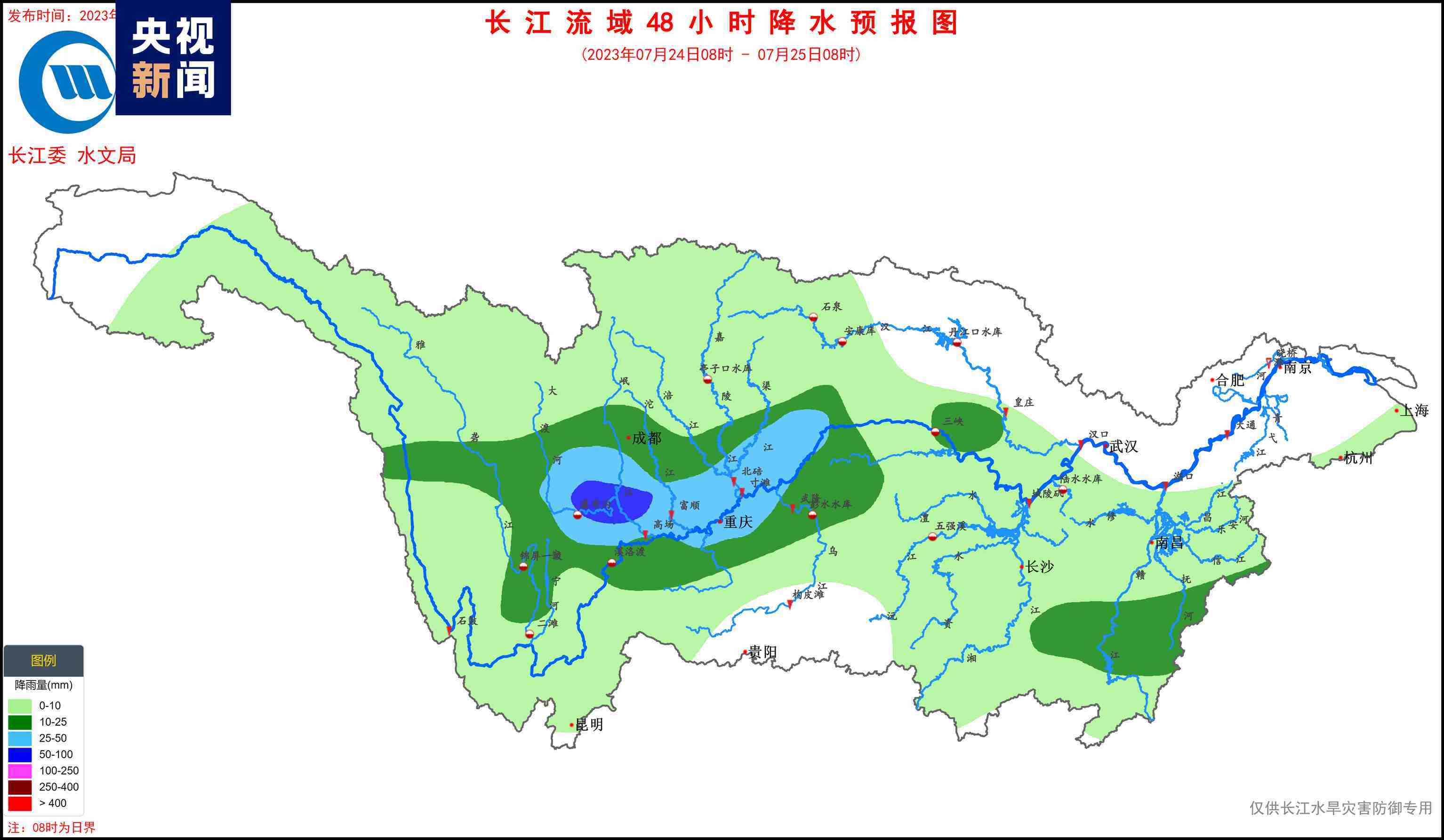 據水文氣象預報,7月23日,嘉岷流域北部有中雨、局地大雨;24~27日,長江上游干流附近有中到大雨、局地暴雨的降水過程,過程累計面雨量:長江上游干流70毫米,金沙江中下游、雅礱江、岷沱江、渠江、烏江上游30~50毫米??紤]預見期降雨,金沙江中下游、嘉岷流域、赤水河、烏江、三峽區(qū)間將發(fā)生漲水過程,降雨落區(qū)內部分中小河流可能發(fā)生超警洪水,局部強降雨引發(fā)山洪災害的風險高。