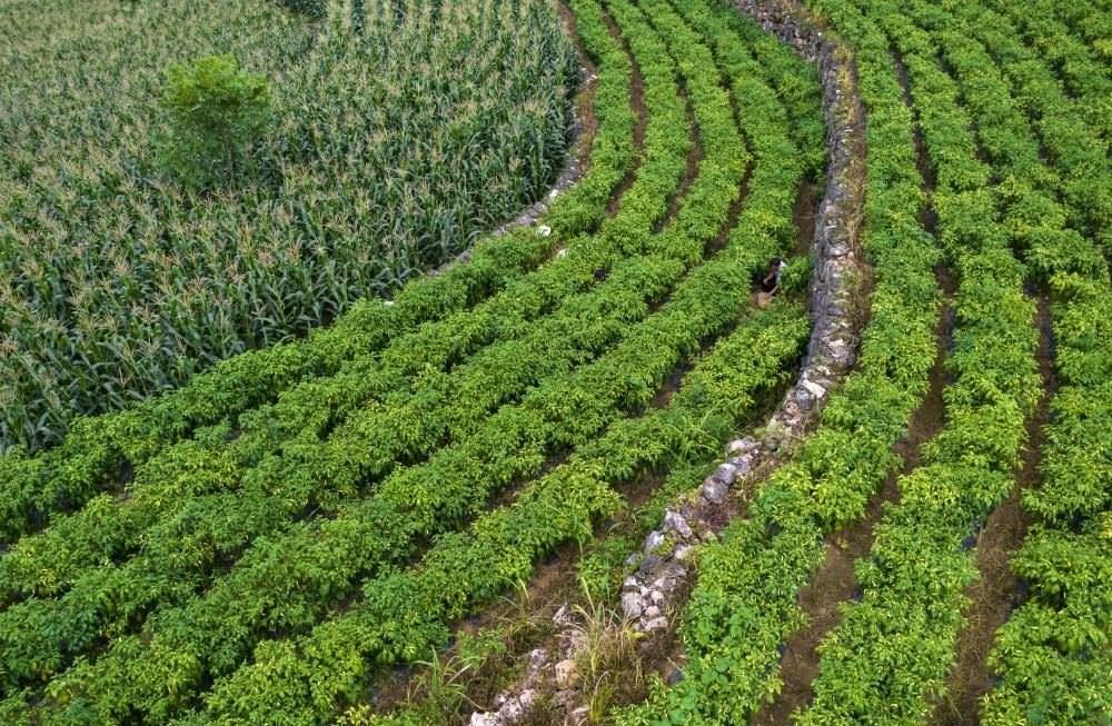 7月27日,一位村民在木者村“摸石谷”中建成的“三?!迸_(tái)地上干農(nóng)活。新華社記者 楊植森 攝