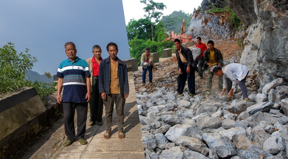 拼版照片:右圖為2013年李華明(左一)和巖頭村村民楊運(yùn)富(中)、李光才(右二)一起修路的資料照片(西疇縣融媒體中心供圖,陳明凱攝);左圖為2023年7月26日李華明(左)、楊運(yùn)富(中)和李光才一起在他們修好的出村路上合影(新華社記者 費(fèi)茂華 攝)。