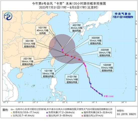 8月1日開始,受副熱帶高壓變?nèi)?、形態(tài)改變的影響,“卡努”的引導(dǎo)氣流將變得不太清晰,其移速也將減緩。最新預(yù)報顯示,“卡努”將以每小時15-20公里的速度向西北方向移動,強度還將有所增強,8月2日夜間移入東海,逐漸轉(zhuǎn)向偏北方向移動,移速明顯減慢。
