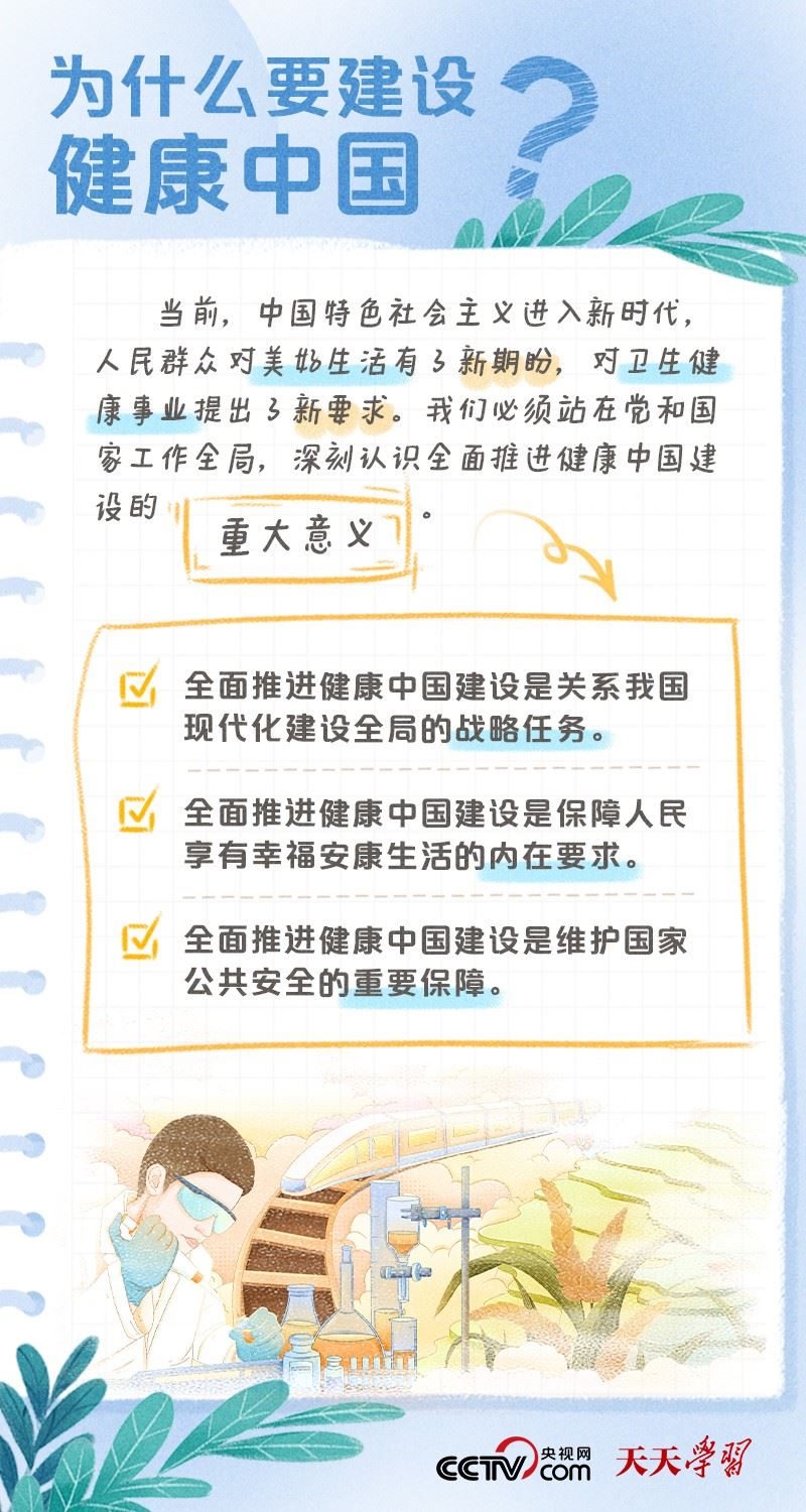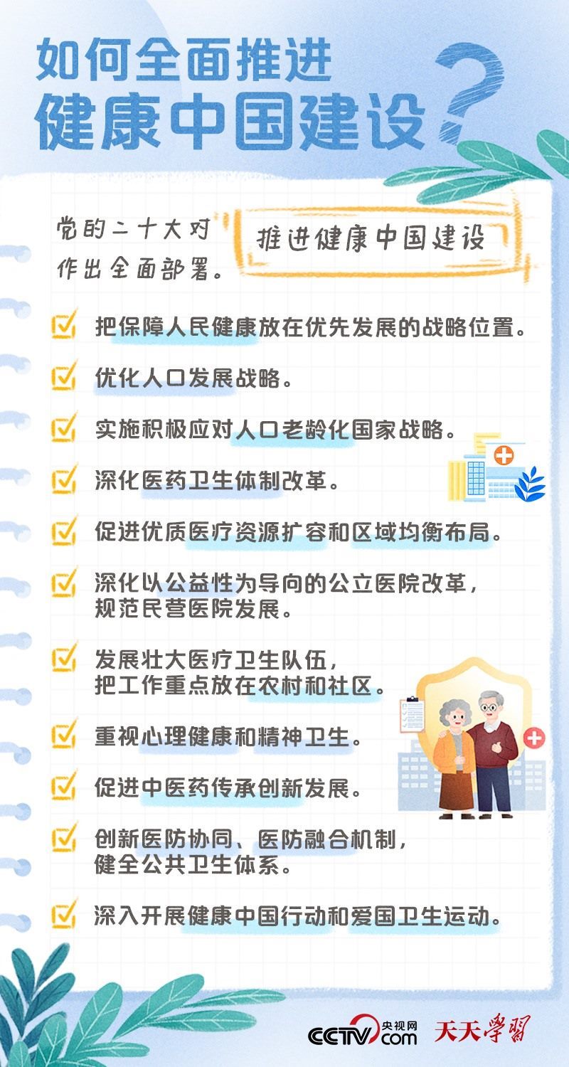 黨的二十大報(bào)告將“建成健康中國”作為到2035年我國發(fā)展的總體目標(biāo)之一,并指出,人民健康是民族昌盛和國家強(qiáng)盛的重要標(biāo)志,把保障人民健康放在優(yōu)先發(fā)展的戰(zhàn)略位置,完善人民健康促進(jìn)政策。什么是健康中國?如何全面推進(jìn)健康中國建設(shè)?央視網(wǎng)《天天學(xué)習(xí)·學(xué)習(xí)筆記》特梳理相關(guān)內(nèi)容,為您解讀總書記治國理政關(guān)鍵詞——健康中國。