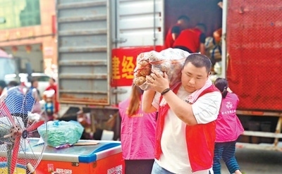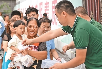 8月6日,河北省涿州市碼頭鎮(zhèn)向五村,天津市阿米瑪瑪何莊子農(nóng)產(chǎn)品批發(fā)市場(chǎng)工作人員為受災(zāi)群眾免費(fèi)提供盒飯。本報(bào)記者 雷 聲攝