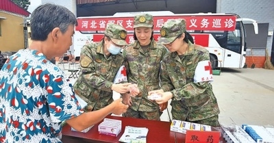 8月9日,河北省軍區(qū)石家莊第三干休所醫(yī)生為當(dāng)?shù)厥転?zāi)群眾義診并發(fā)放藥品。劉松峰攝(人民視覺(jué))