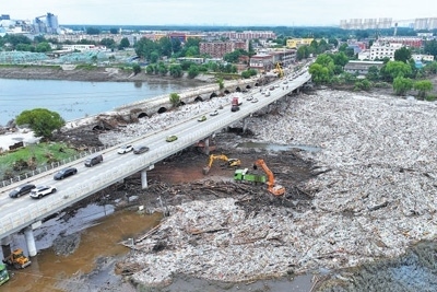 8月7日,北京市房山區(qū)琉璃河橋,大型機(jī)械在清理水面漂浮物,疏通河道。本報(bào)記者 雷 聲攝
