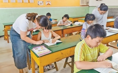 8月8日,河北省獻(xiàn)縣樂(lè)壽鎮(zhèn)東翟小學(xué)安置點(diǎn)內(nèi),學(xué)校老師為學(xué)生輔導(dǎo)功課。本報(bào)記者 邵玉姿攝