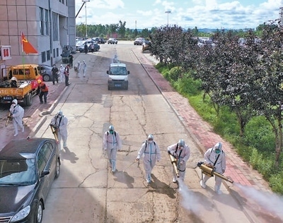 8月8日,黑龍江省尚志市,工作人員對(duì)洪水過(guò)后的道路進(jìn)行消毒。張藝開(kāi) 尚鵬程攝影報(bào)道